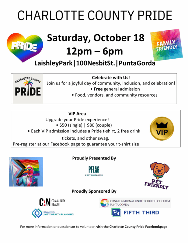 - Our goal is to create an event that brings awareness to and celebrates the LGBTQ+ community in the area, as well as fosters a sense of togetherness with all members of the Charlotte County and SW Florida communities! The event will be held October 18, 2025 at Laishley Park. Vendors, sponsors, and volunteers needed! Follow the event on Facebook for more event information and updates!https://www.facebook.com/share/p/12JLFde85p8/
